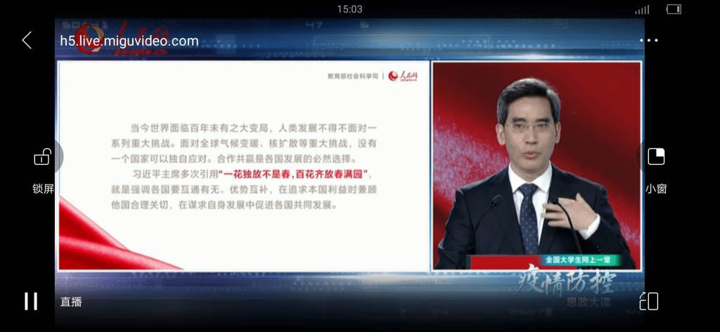 活动最后,全体人员共同收看了“全国大学生同上一堂疫情防控思政大课”。通过聆听艾四林、秦宣、王炳林、冯秀军四位教授的讲座,大家把握了党中央关于疫情防控的决策部署,认识到中国抗疫彰显的中国共产党领导和中国特色社会主义制度的显著优势,了解了防疫抗疫一线的感人故事。大家一致认为这堂思政课是“主流价值观”再深入、再深刻、再深情的宣传和教育,纷纷表示要把社会主义核心价值观内化于心外化于行,就像这次抗“疫”英雄们一样,守初心、担使命,群策群力,相守相望�