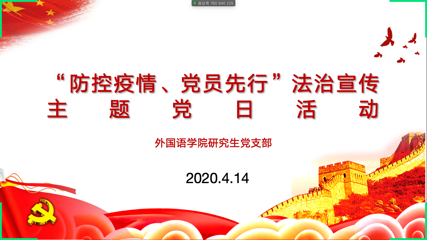 4�14日,外国语学院研究生党支部开展了以“防控疫情、党员先行”为主题的在线党日活动,支部全体成员参加活动,会议由支部书记籍天璐主持�