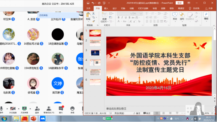 4�16日,本科生党支部开展了“防控疫情、党员先行”法制宣传线上主题党日活动,支部党员、发展对象、入党积极分子参加活动,会议由支部书记刘娇主持�