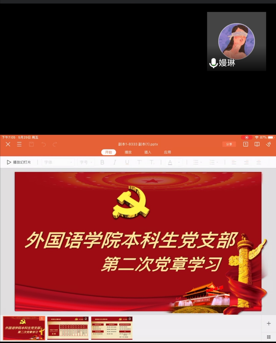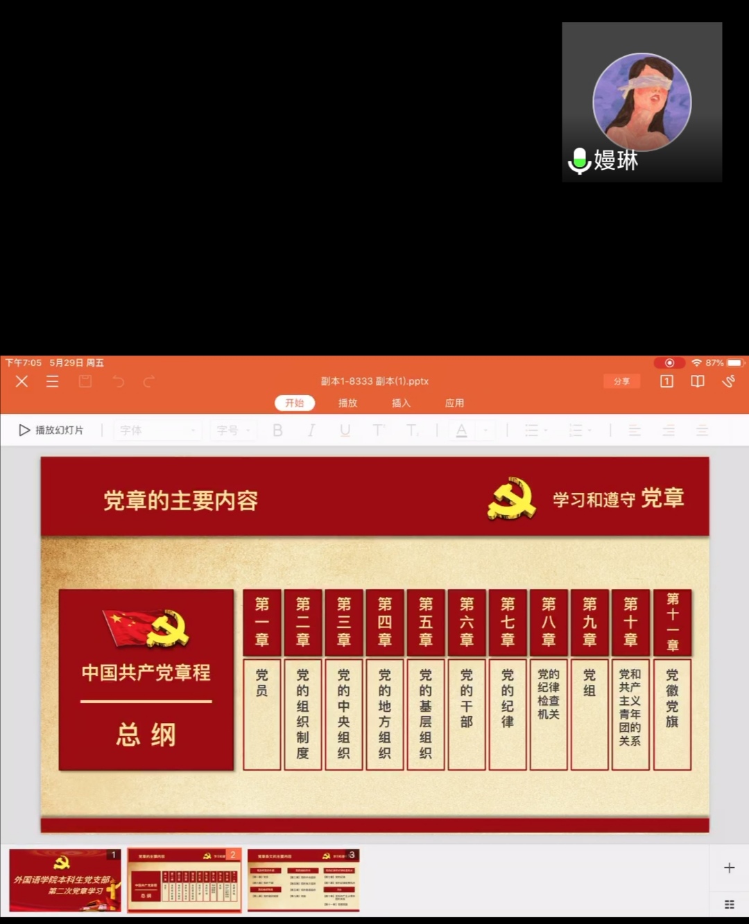 本次活动学习内容是党章的�7章至�11章,大家积极分享了党章学习的感想及经验。党章第七章主要内容是党的纪律,大家通过自主学习与重点讲解进行了学习;党章第八章是党的纪律检查机关,��琳同志带大家学习了党的纪律检查机关具体有哪些�18翻译的孟颖同学进行了诵读学习;党章第九章是党组,张永平同志带大家进行了诵读学习,并讲解了重点内容;党章第十章是党和共产主义青年团的关系,张永平同志详细的介绍了共产主义青年团和党的关系,同时也分析了容易记忆出错的地方;党章第十一章是党徽和党旗,��琳同志详细向大家介绍了党徽党旗的构成部分。在会议的最后,主持人对几次线上学习的情况进行了总结,学习完党章九到十一章之后,大家进行自由讨论,总结下自身的不足和接下来的学习规划,18日语的张雨佳�18翻译的才拉吉带头进行了发言�
