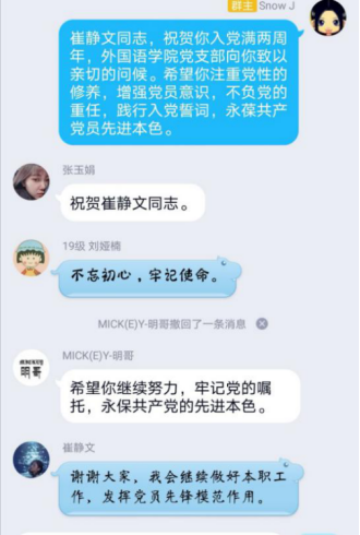 随后�刘娅�同志�了题为《身边的榜样》的微党�。党�讲述了农民铁人范振喜、人民好公仆焦裕禄和恪守风格的太��愚公李保国等先进党员的故事�她号召广大党员要以榜样为力量在生活中充分发挥先锋模范作用。活动最后,支部为崔静文同志过了政治生日,她回顾了自己的入党经历并表示自己将会坚定入党初�,继续前行,争做一名优秀党员�