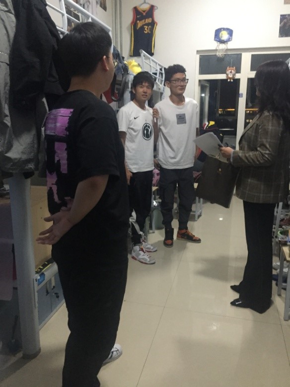当晚重点走访了新生和毕业班宿舍。马书记亲切地和同学们进行交流,询问起了学生们的家乡,鼓励宿舍的同学们要团结,本省的同学要照顾好外省的,让他们感受到同学间的热情,外省的同学也要尽快自我调整适应环境。马书记鼓励新生们尽早适应学校的环境,养成良好的生活学习习惯,珍惜大学时光,努力成长成才。辅导员殷老师也表示大学生活是需要大家互相理解、互相包容的,只有这样,大家才能共同努力,一起进步。