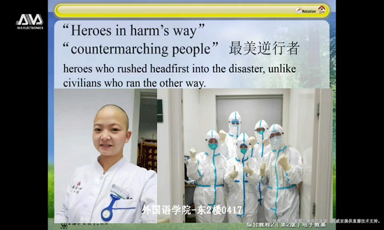 在教学内容方面,一方面,王芳老师根据课程特点和学生能力培养等计划,加强了对于文化、语言修辞以及写作技巧等方面的教学,充分体现《综合英语》课程中对于“综合”能力培养的特点。另一方面,将教学内容和思政教育相结合,以当前的新冠状病毒为导入,将抗疫防疫等相关中英文词汇进行整理,融入课堂教学中,既帮助提升学生语言应用能力,也充分激发其爱国情怀和民族责任感。