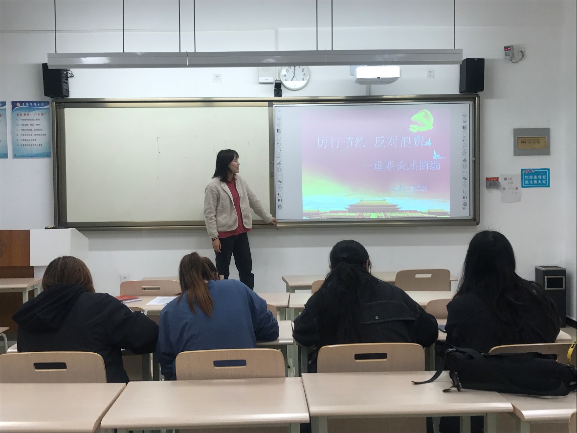 本次主题党日活动按照5+X模式进行。在理论学习上,重点进行了《中华人民共和国宪法》,《中国共产党基层组织选举工作条例》,习近平总书记对制止餐饮浪费行为作出的重要指示等文件的学习。何乃婷同志以“厉行勤俭节约,反对餐饮浪费”为主题讲授了党课,并与全体党员自查学习生活中的勤俭节约餐饮浪费行为。全体成员受益匪浅深刻表示将把勤俭节约作风贯穿到日常学习生活中,内化于心,外化于行,严于律己,树立党员的良好形象,发挥党员的榜样作用,做到“以节约粮食为荣,以浪费粮食为耻”。