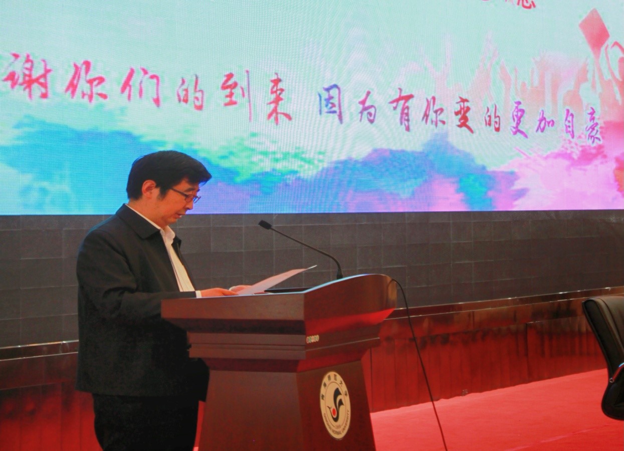 副校长赵海兴在致辞中回顾了青海师范大学在各项工作中的成绩和展现的团结奋斗精神,同时寄语全体新生,要励志为先,为自我实践开启天生动力。做一个踏实的人,勇于实践,自强奋发,不负时代的嘱托;勤学为要,为自我发展奠定坚实基础。重视自己的人格塑造,加强学习,提升自身各方面的能力;立德为本,为自我完善筑牢道德底线,将大学的包容性融入自身生活,学会感恩,以感恩润泽自身成长历程。以青春之才智,建设青春之家国,用真才实学扛起时代的重任�
