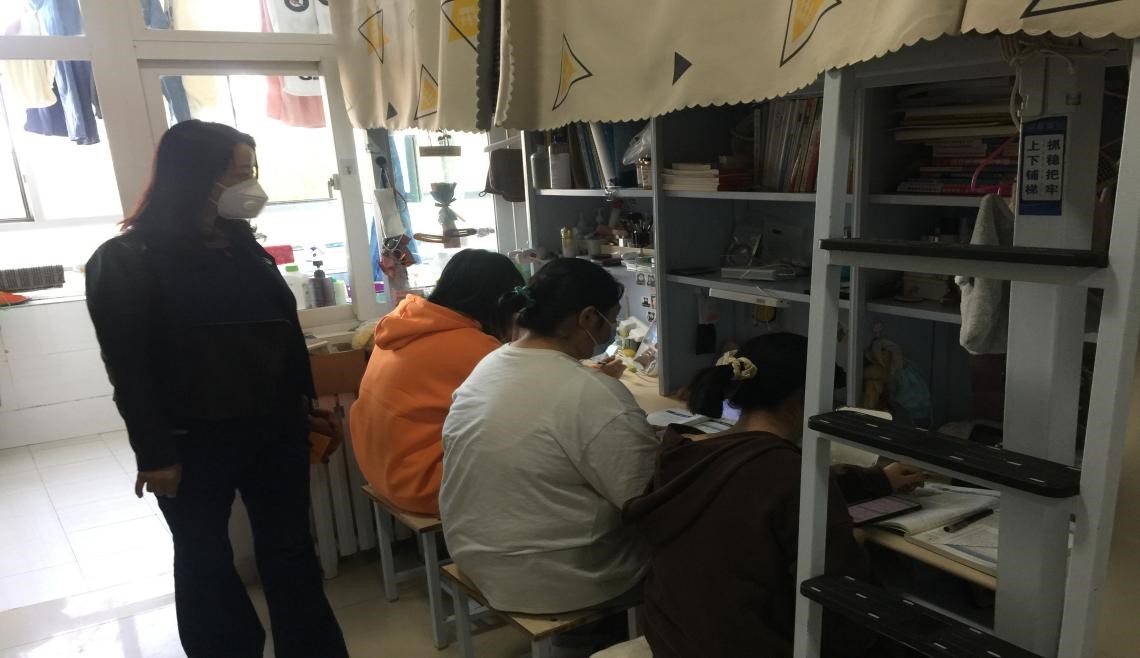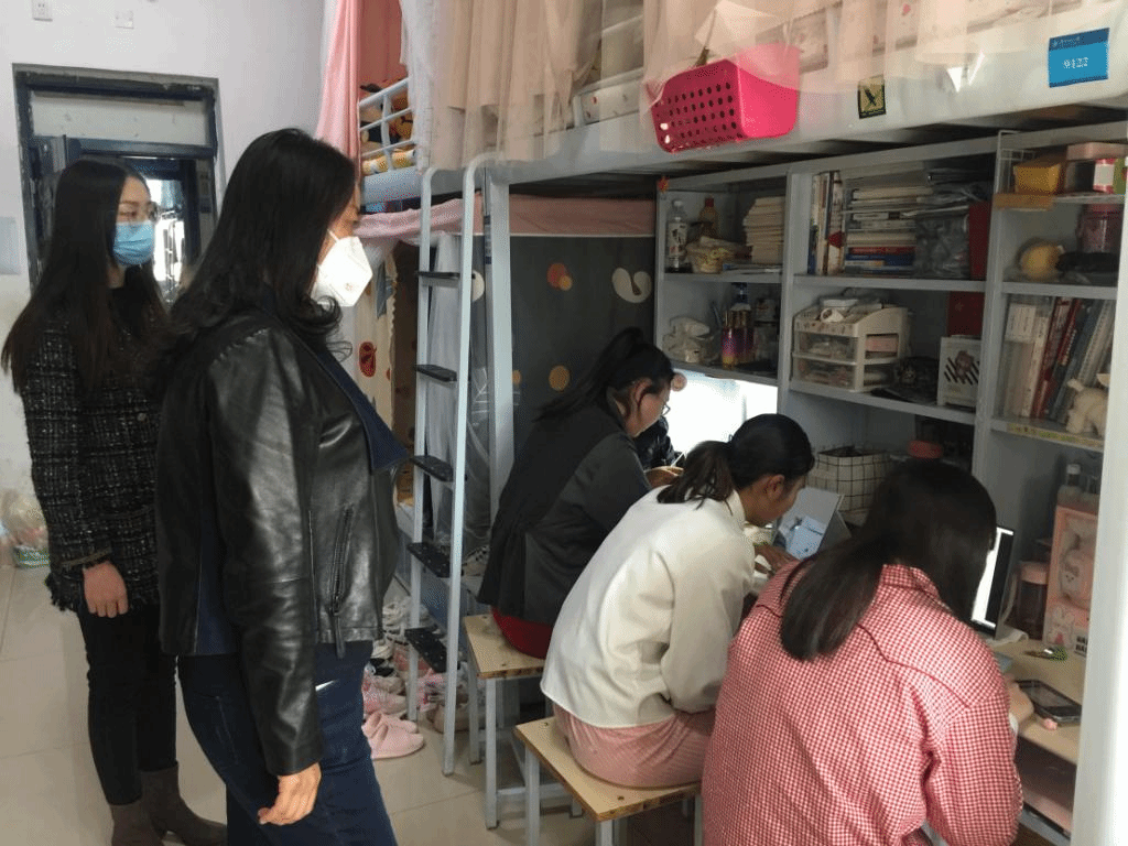 11�5日,在马金芳书记、李增垠院长的带领下,外国语学院教务干事陈学莲、辅导员殷春兰深入学生宿舍,检查本学院线上教学和学生学习情况�