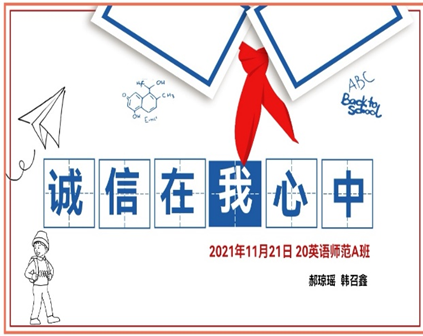 20级三个班级同学通过将诚信分成两个部分进行阐述。第一,通过讲述华盛顿砍树的故事说明了诚信做人的重要性,引导同学们做到真诚待人,诚实守信。第二,强调同学们要诚信做事,通过分享总结生活中的诚信习惯来增强同学们的诚信意识,希望大家做一个说到做到,实事求是,勇于承担的人�