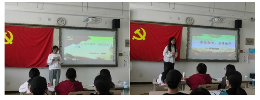 首先由两名优秀积极分子分享她们近期的志愿活动经历。疫情期间,两名入党积极分子在核酸检测现场组织同学们有序排队、测温、扫码,使核酸检测工作紧张而有序地进行。特别令人感动的是,在天气异常寒冷且身体不适的情况下,她们仍然坚守岗位,这份坚持让大家从心底里敬佩。其中一位积极分子讲述了身边的例子:她的亲人也是一名共产党员并且严于律己、兢兢业业,并通过自己的努力,调动了当地村民的积极性,使当地快速发展,村民的生活水平也有了明显的改善,起到了榜样的示范作用。同学们听后都为之动容,深受感动。每个党员在日常生活中都应以身作则、吃苦耐劳,坚持全心全意为人民服务的宗旨�