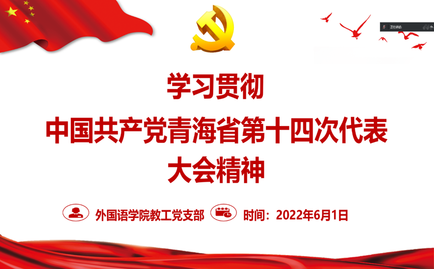6�1日下午,外国语学院教工党支部通过视频会议的形式,在线上召开专题学习会,传达学习贯彻中国共产党青海省第十四次代表大会会议精神,对学院疫情防控重点工作进行再要求再落实。外国语学院副院长,教工支部书记妥洪岩主持会议,学院党总支书记马金芳参加学习并做工作要求,支部全体党员及入党积极分子参加�
