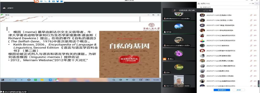 首先,何老师向大家介绍文学作品传播和流行重要范式之一就是语言模因的传播过程。模因被复制传播的重要条件是人的心理推动。“难民元素”是文学作品中的一个重要语言模因,在很多作家的笔下得以体现��卡勒德·胡赛尼的作��可以清晰地看到“难民元素”语言模因的复制和传播。胡赛尼透过难民元素语言模因表征文本内外世界的同时,以人类的共情能力推动为依赖,在“人类命运共同体的”的宏观视野关照下,倡导建立一种与他者共在,自我为他者承担责任的共情能力。之后,何老师向大家介绍模因最早是由新达尔文主义倡导者,牛津大学著名动物学家和行为生态学家理查德·道金斯提出。语言模因形成的条件主要是模因语言载体的形式特征和语用特征,模因载体的易学性,经济性,能产性,模因载体的实用性,形象性,时尚性�与此同时何老师�向大家介��文学语境中的难民元素模因和共情概念的溯源。其次,何老师向大家介��几部相关文学作品。对文学作品的语言模因研究,是当今社会文化传播的紧密互动。在文学语境认知框架下,语言模因的传播方式,以及人类共情能力的推动,对于研究,揭示语言模因的社会文化功用具有着一定的理论和价值意义�