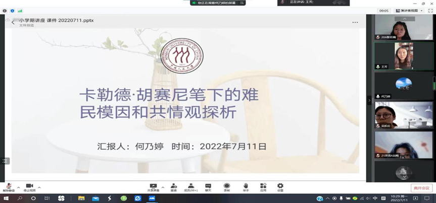 星霜荏苒,居诸不息�2022年青海师范大学暑期小学期因受疫情影响以线上形式举行,7�11日,外国语学院院级讲座如期举行,本次讲座有幸请到青海师范大学外国语学院教师何乃婷老师为大家做题为“卡勒德·胡赛尼笔下的难民模因和共情观探析”的主题讲座�