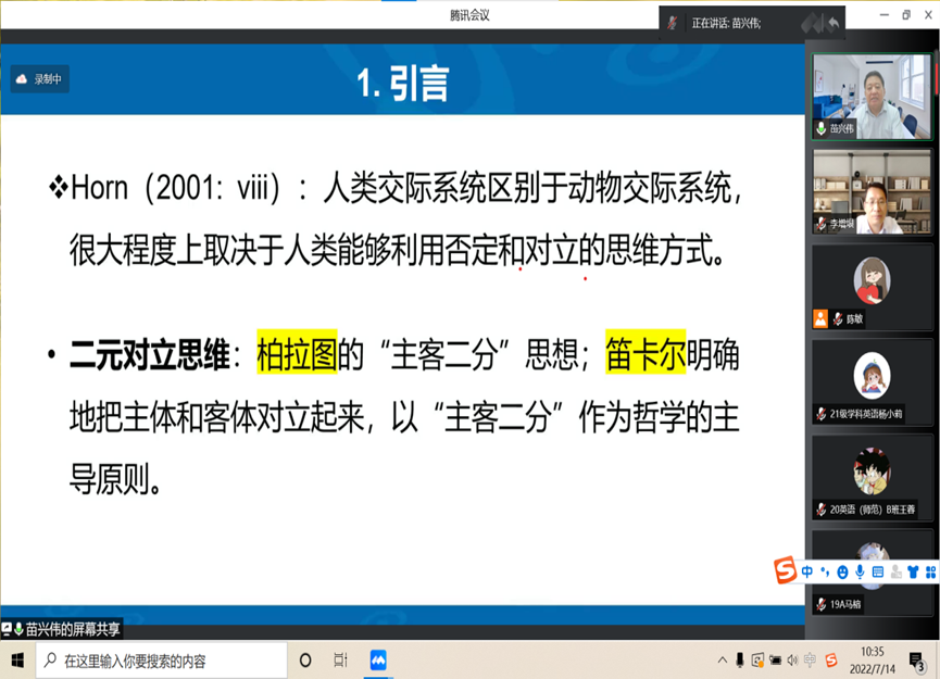 为提高学生综合素养,营造良好学术氛围,拓宽师生学术视野�2022�7�14日上午,北京师范大学外国语言文学学院院长、博士生导师苗兴伟教授应邀在线为外国语学院师生开展题为“文学语篇中对立意义的文体效果”的学术讲座,学�2019级�2020级�2021级本科生及全体研究生及部分教师教师参加了本次讲座。讲座由学院院长李增垠主持�