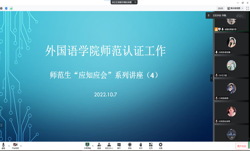 为了更好地迎接专家线上认证工作,让师范生更好地理解和掌握英语专业师范认证的相关内�,在马金芳书记的组织下,学院�2022�10�7日举行师范专业学生线上师范类认证工作“应知应会”培训会�