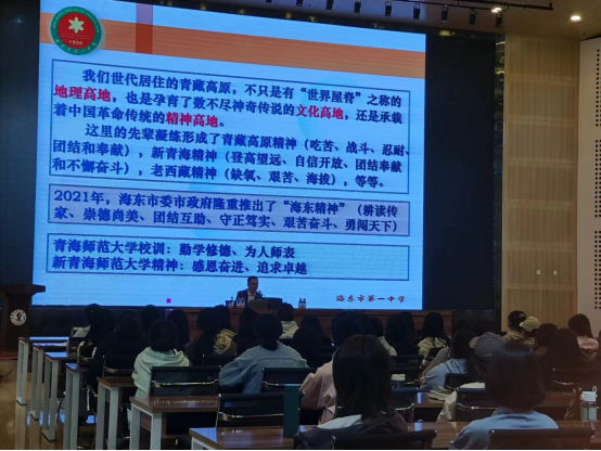 周老师首先对于自己的个人成长经历做了“汇报”:有梦不觉天涯远。 周老师指出,自己出生在一个山大沟深、交通不便的乡村,祖辈靠天吃饭、喝地窖水,世代务农。为了帮助自己和更多孩子摆脱代代相传的贫困,当一名光荣的人民教师变成了周全中老师一生的梦想。1991年,周老师从乐都师范毕业,圆了教师梦。他决心用所学来培育更多的农村孩子,与学生一起成长。同时周老师指出“我们世代居住的青藏高原是孕育了数不尽神奇传说的文化高地,还是承载着中国革命传统的精神高地”,周老师结合青海师范大学的校训“勤学修德,为人师表”以及“感恩奋进、追求卓越”的师大精神进行讲解,对同学们起到了极大的激励作用。