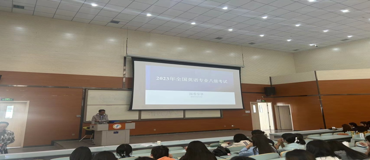 裴正华老师今年前往上海外国语大学参加了英语专业八级考试阅卷工作。裴老师依据该次阅卷经验以及学习心得,对英语专八考试进行了详细而全面的剖析,尤其是阅读简答题和翻译题答题技巧给予指导,并给同学们提出了几点学习建议。两位老师的分享受到了在场学生热烈的欢迎。