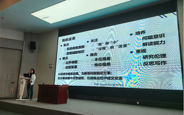 讲座中,侯教授以Site Space可视化分析工具为引子,从研究选题、文献综述和研究方法的选择等方面做了介绍。侯教授以自己博士论文写作过程为例生动讲解了行动研究和民族志研究方法在外语教育研究的运用,并倡议大家构建外语学术实践共同体,共同在学习和科研的路上不断前行。
