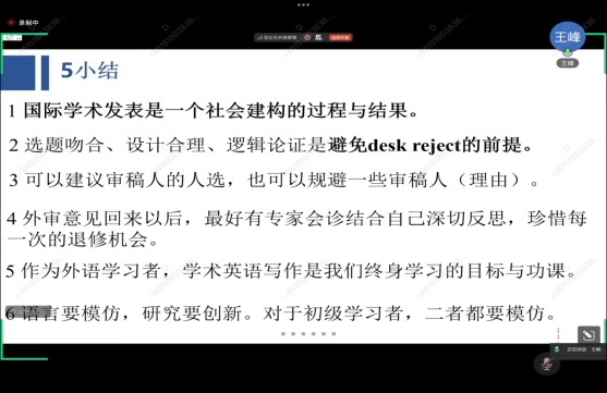最后王峰教授总结了发表过程的核心原则国际学术发表是社会建构的过程,需契合期刊与学界的认知逻辑;选题匹配期刊方向、研究设计合理、逻辑论证严谨,是避免“desk reject”的核心前提;收到外审意见后,建议结合专家会诊与自我反思修改,珍惜退修机会;学术英语写作是外语学习者的终身学习目标;初级学习者需同时模仿语言表达研究设计,逐步向研究创新过渡。