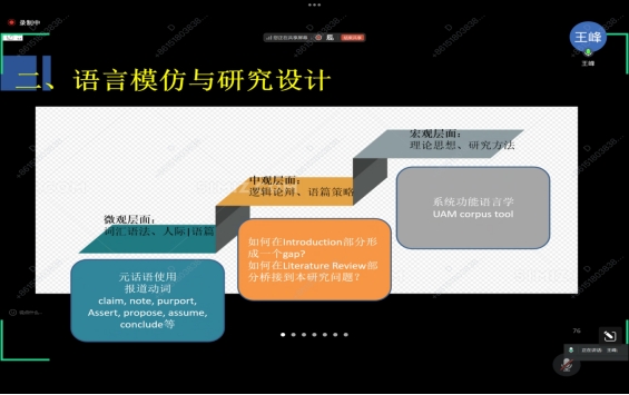 王峰教授还提出论文写作需兼顾语言规范研究逻辑分三个层面落实宏观层面匹配领域主流理论与工具;中观层面聚焦语篇策略(文献综述如何衔接核心研究问题);微观层面模仿学术语篇的元话语、报道动词比如区分claim, note, purport, assert词的用法