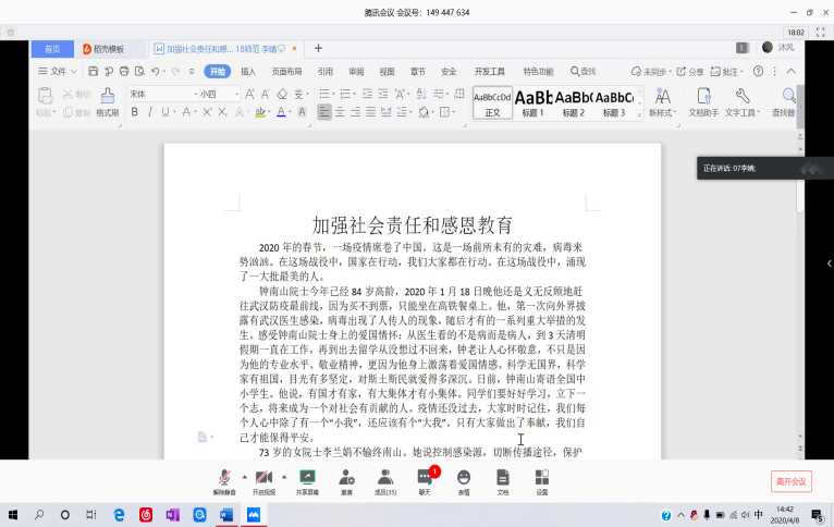 各团支书带头组织全体学生通过观看新闻报道、阅读报纸资料、列举典型案例等形式了解了疫情期间需要遵守的法制规则,教育引导学生坚定信心,集思广益,积极行动,正面发声。同时教育学生们深刻认识以钟南山、李兰娟为代表的的广大医护人员临危受命、迎难而上、负重逆行的高尚品格和勇气担当,进一步增强责任感使命感。学习中,各班同学针对此次活动主题积极查找资料,并针对加强法制和规则教育、加强社会责任和感恩教育分别作了微课讲授。