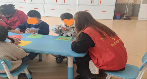 2.活动开展过程首先,四位志愿者被分别分入大班、中班、小班;其次,每位志愿者根据授课内容辅助特教老师上课。在本次活动中我被分入中班,我们进行了手工课、积木课,以及一节活动大课。在手工课上主要锻炼孩子们的动手能力以及专注能力,孩子们在老师分发的卡纸上将粘土制作成老师指定的形状,我辅助老师将粘土分发给孩子们,指导他们按步骤制作所需图形。积木课可以锻炼孩子们的思维和想象能力,以及动手能力,在课上主要辅助老师让孩子们专注上课。在活动课上,老师与孩子们进行了套圈游戏,我主要安抚一些躁动的孩子,让他们根据老师的指令做出相应的动作,帮助老师维持课堂秩序。最后,课后帮助老师归置道具,本次的活动内容就结束了。