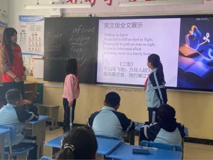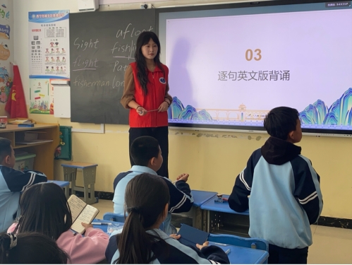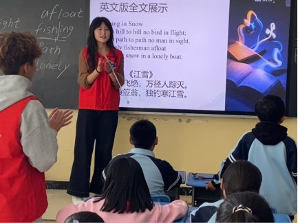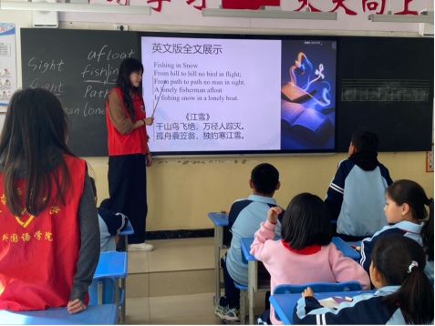 20251017日,KPL直播 本科生党支部志愿者前往西宁市城北区泉湾小学,开展“语泉相助,荧光相行”诗歌教学志愿服务活动。活动以英文版《江雪》为教学内容,通过诵读、释义、背诵与创意演绎相结合的方式,引导学生感受英语语言之美,体验诗歌意境,提升语感与记忆能力,实现英语学习与传统文化感知的双向融合。