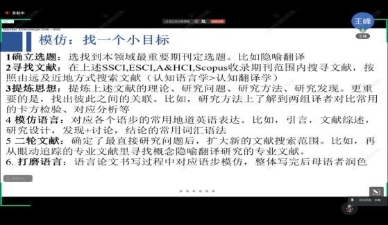 随后王峰教授详细讲解SSCI发表的小目标实施路径提出以模仿为核心的SSCI论文写作的六个步骤一是确立选题:锁定本领域重要期刊,以期刊偏好定选题方向;二是寻找文献:限定在SSCIESCIA&HCIScopus收录期刊范围内,按由远及近逻辑检索;三是提炼思想:梳理文献的理论基础、研究问题、方法、结论,并建立文献间的关联;四是模仿语言:学习论文各语步的地道英语表达;五是二轮文献:确定核心研究问题后扩大检索范围;六是打磨语言:按语步模仿完成初稿后,邀请母语者润色语言。